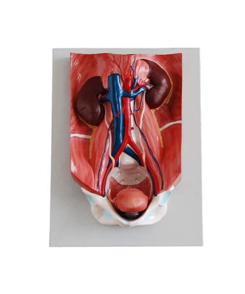 يوضح النموذج هياكل التجويف خلف الصفاق ، والحوض مع العظام والعضلات ، والوريد الأجوف السفلي ، والشريان الأورطي بفروعه ، والمسالك البولية العلوية ، والكلى مع الغدة الكظرية ، والحالب ، والمثانة ، إلخ. قابل للفصل إلى 4 أجزاء.